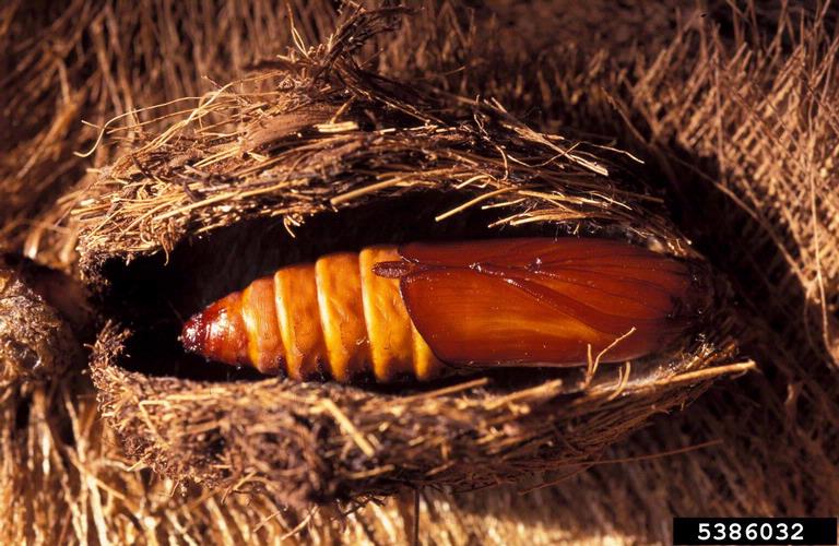 Es handelt sich um den „Paysandisia archon“, eine palmendurchbohrende Raupe, die genau wie der Palmrüssler Phoenixpalmen und Washingtonia-Arten so sehr schädigen kann, dass sie absterben.