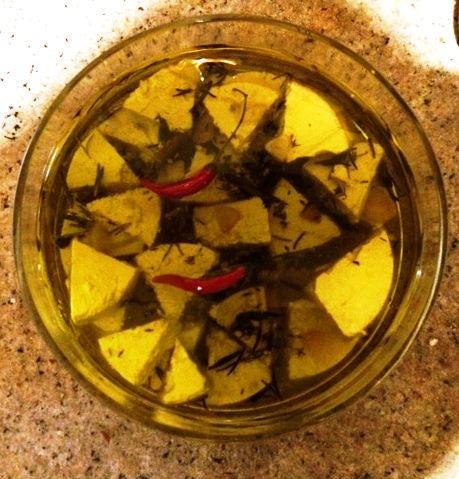 Immer darauf achten, dass der Käse vollständig mit Öl bedeckt und das lichtundurchlässige Gefäß gut verschlossen ist. Glasbehälter (wie auf dem Foto unten) sind für die längere Aufbewahrung ungeeignet. Den Käse in einem kühlen Raum lagern, denn im Kühlschrank flockt das Öl aus! Auf diese Weise konserviert hält der Käse ein paar Wochen. Er schmeckt als Tapa oder zum Salat.