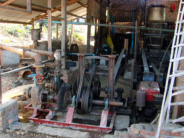 Zufällig kommen wir am Wasser-Pumpwerk von Mrauk U vorbei, schon von Weitem zu hören.