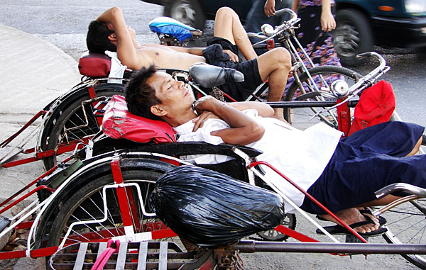 Bevor wir später auf ein Boot gehen, will ich noch schnell in den Markt radeln, um ein paar Schnappschüsse zu tätigen. Diese noch nicht ganz muntere Gesellschaft hat womöglich das gleiche Ziel.