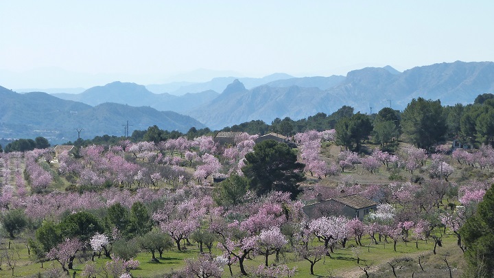unterwegs überall blühende Mandelbäume, bei Relleu auch noch wenige Felder mit knospigen Bäumen