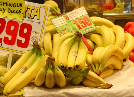 Beruhigend ist es zu wissen, dass in Kolumbien, einem Erzeugerland, die Bananen günstig sind.