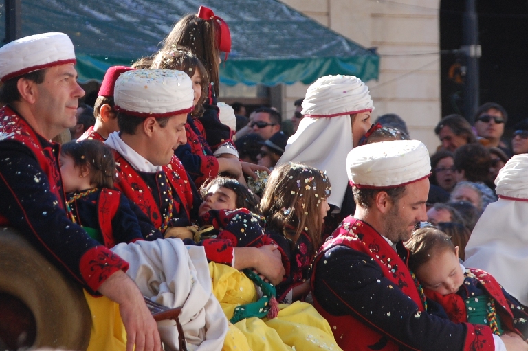 Auf den sonnenbeschienenen Rängen versuchten sich die Zuschauer vor den sengenden Strahlen mit Schirmen, Hüten, dunklen Brillen oder Fächern zu schützen. Dem ohne Unterlass von den umliegenden Balkonen herab fallenden Konfetti-Regen konnte jedoch keiner entfliehen. Zuschauer ohne Sitzplatz standen auf der Plaza genauso dicht gedrängt nebeneinander wie Sardinen in einer engen Blechdose, während edle Pferde, stoisch kauende Dromedare und Moros, von denen etliche wahlweise einen Falken oder ein Baby auf dem Arm hielten, an ihnen vorbei defilierten, während es sich die christlichen Truppen schon auf der plaça del dins (hinter dem Rathaus), in den vielen kleinen Bars und Vereinshäusern rund um das Geschehen gut gehen ließen.