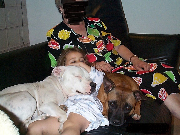 Ich habe Got sei Dank auch noch kein gebissenes Kind gesehen, kann mir aber auch nicht vorstellen, dass du schon ein Gesicht von einem Kind gesehen hast, das von einem Pitbull angefallen wurde - außer aus der Bild-Zeitung. Du magst es zwar kaum glauben, aber auch Schäferhunde, Rottweiler, Pudel, Dackel beißen Kinder. Man sollte niemals Kinder (besonders Kleinkinder) mit Hunden alleine lassen (Das gilt aber Rasseunabhängig). Nur so am Rande: Der Staffordshire Bullterrier heißt in England übrigens "Nanny-Dog", was soviel wie Kindermädchenhund heißt. Er ist sehr geduldig mit Kindern. Unsere Tochter und deren Freundinnen, die alle über 15 Jahre (täglichen) Kontakt zu unseren Bestien hatten, sind übrigens alle ohne Bisswunden und Narben groß geworden (Mann, was hatten wir für ein Glück).