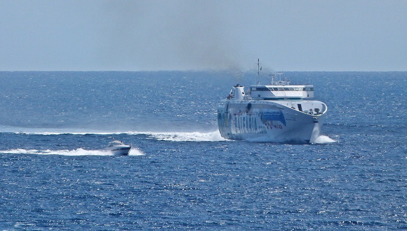 Nach 21 abwechslungsreichen Tagen wartete die Fähre in Palma auf uns, ein letzter Blick zurück auf die Kathedrale und das Castell de Bellver und während auf den Kreuzfahrtschiffen die Passagiere frühstückten und im Minutentakt Flugzeuge über Palma einflogen, legten wir pünktlich um 8 Uhr morgens ab. Adiós Mallorca! Unterwegs überholte uns ein anderes Schiff der Balearia. Holá Ibiza!