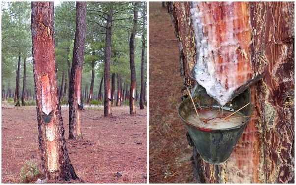 Unterwegs fielen mir die Bäume auf, die alle angeschlagen waren um daraus das Harz? zu gewinnen.