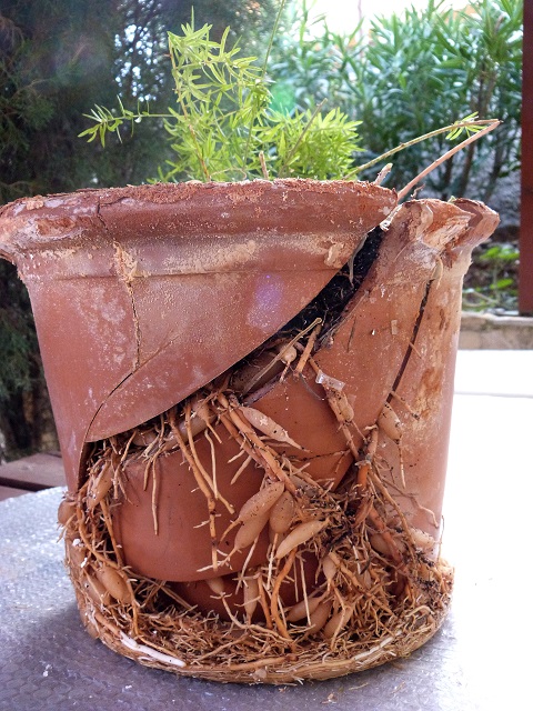 Heute habe ich mal meinen Topf mit Asparagus unter die Fittiche genommen. An dieser Pflanze hänge ich sehr, habe ich sie doch von Heidi (einem Forenmitglied, die "alten" werden sich noch erinnern) kurz vor ihrem Tod 2011 geschenkt bekommen. Sie wollte die Pflanze entsorgen, weil sie so sperrig war. Bei mir steht der Asparagus das ganze Jahr auf der Terrasse, bekommt sein Wasser und selten auch mal Dünger und wird ab und zu beschnitten. Als ich den Topf aus dem Übertopf nahm, staunte ich nicht schlecht - die Wurzeln hatten den Topf gesprengt.