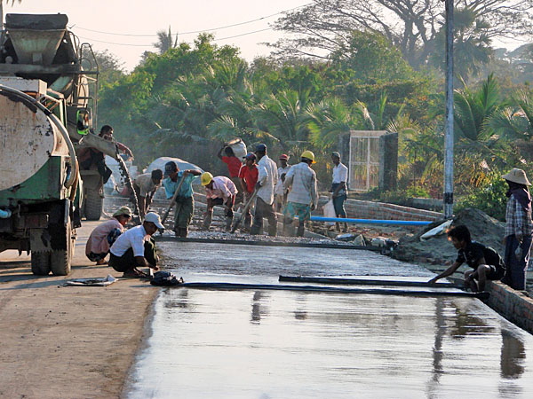 Die Zähne der jungen Frau sehen bereits angegriffen aus. Dies deutet auf ein Genussmittel hin. Betelnuss wird in mehreren asiatischen Ländern konsumiert. Aber kaum anderswo haben so viele Menschen rote Zähne, kleben so viele rote Pfützen auf dem Boden. Während man bei uns solche Zahnruinen kaum zeigen würde, gehen die Burmesen völlig locker damit um. Straßenbau in Sittwe: in Handarbeit wird eine neue Fahrbahn betoniert Für die Feinarbeit an den Straßenrändern setzt man "Spezialistinnen" ein.... Fischerboote am nahe gelegenen Strand Nach 2 Tagen verlassen wir Sittwe auf dem „Government Boat“. Zuerst über eine Meeresbucht und dann entlang des Kaladan: eine von Myanmars zahlreichen Pagoden grüßt vom Flussufer Keine Regatta, sondern "Berufsverkehr" mittels traditioneller Boote: Transporte und / oder Fischerei Zwischendurch gibt es Stops. Leute und Waren werden entladen oder aufgenommen. Unser Ziel erreichen wir nach ca. 6 - stündiger Fahrt auf dem Kaladan Fluss: Mrauk-U war die letzte königlichen Hauptstadt des einst mächtigen Arakan., das im 18.Jh unter die Fittiche der Briten genommen wurde.