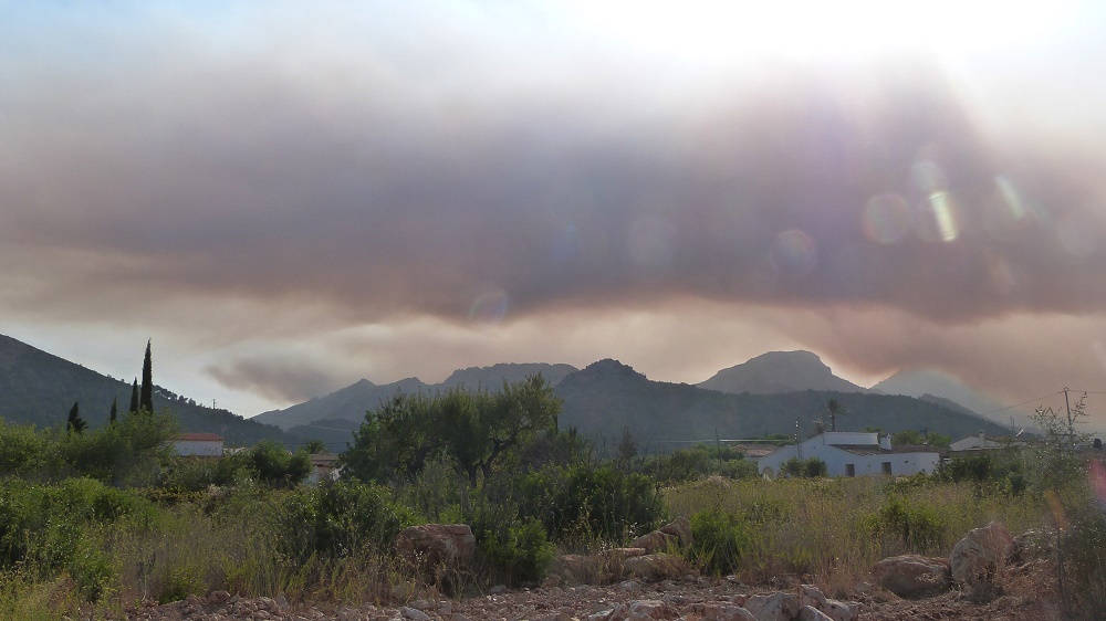 Selbst bei uns im Jalóntal kann man die Rauchwolken sehen, die Löschhubschrauber fliegen schon seit dem frühen Morgen. Als wir vor 2 Stunden aus Calpe kamen, standen auch Rauchwolken hinter Pinos (könnten zu dem Brand gehören, von dem Derek berichtete). Hoffen wir, dass der Spuk bald vorbei ist und die Polizei die Schuldigen findet!