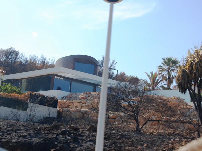 Anders sieht es in dem Piniengebiet rund um das Wohngebiet Cansalades aus. Dort stehen manche Häuser wirklich "völlig entblößt" da, ihres grünen Schutzes beraubt. Es liegt immer noch ein scharfer Brandgeruch in der Luft. Auch wenn die Häuser unversehrt wirken, steht den Eigentümern eine harte Zeit bevor. Selbst wenn sie morgen wieder neu pflanzen würden, wird es Jahre dauern, bis annähernd wieder das entstanden sein wird, was das Feuer zerstört hat. Viele dieser Menschen werden das nicht mehr erleben, weil sie schon lange im Rentenalter sind. Andere haben in eine grüne Natur hinein ihr neues Haus gebaut und schauen nun aus ihren Panoramafenstern auf eine trostlose, graue Mondlandschaft.