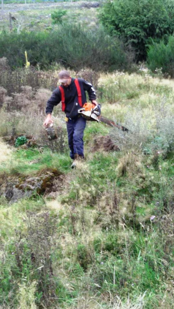 Der freundliche Farmer hatte ganz zufällig seine Kettensäge dabei und verschwand im Gebüsch. Gemeinsam hat man dann Holzklötze in verschiedener Ausdehnung herangeschafft. Nun kann man im Wechsel Wagenheber ansetzen, Holzklotz unterschieben, Wagenheber unterfüttern und wieder ansetzen, größeren Holzklotz unterschieben....... Jetzt wäre alles gut, wenn das Ersatzrad nicht dauernd Luft verloren hätte, aber es hat immer so 20 km bis zur nächsten Tankstelle gereicht um Luft nachzufüllen.