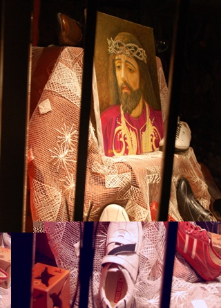 Es wurde dunkel. Auch vor der Kirche „Virgen del Milagro“ stand inzwischen der Paso des gebeugten Jesús Nazareno mit seinem schweren Holzkreuz bereit. Die Prozessionen zogen durch ihre Stadtviertel. Zuschauer im Sonntagsgewand säumten die Straßenränder, die Bewohner der anliegenden Häuser konnten bequem von ihren Balkonen herabschauen. Wer selbst nicht mitmachte, schaute wenigstens zu. Die Haustüren standen offen, die Wohnungen waren beleuchtet und gaben einen Blick ins Innere frei. Schaufenster waren mit Bildern geschmückt: Jesus mit Dornenkrone, das letzte Abendmahl, kunstvoll geflochtene Palmas Blancas aus Elche zwischen Sportschuhen, Unterwäsche und Lebensmitteln…