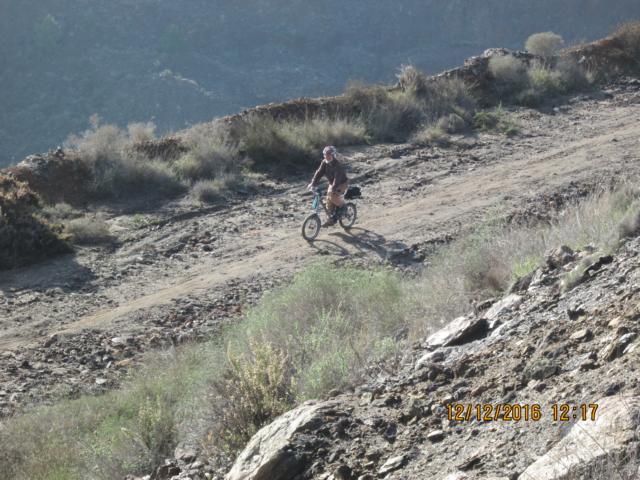 Vorbei am Eingang und der Kapelle ging es dann über groben Schotter hinauf zur Passhöhemit herrlichem Ausblick auf die Bucht von Portmann. Ab hier war es eher was für Mountainbikes. In Serpentinen fuhren und schoben wir durch die vom Bergbau aufgerissene wilde Landschaft mehrfach mußten wir umdrehen, da der Weg plötzlich endete. Im Berg waren auch Baumaschinen beschäftigt. Hoffentlich sind die vor dem großen Regen fertig geworden. Unten auf der Straße dann ein letzter Blick auf das Gebirge, das von uns bezwungen wurde. Ab hier ging es über die Gebirgsstraße nach El Gorguel, die Chemiefabriken und der Ölhafen von Escombreras Richtung Cartagena.