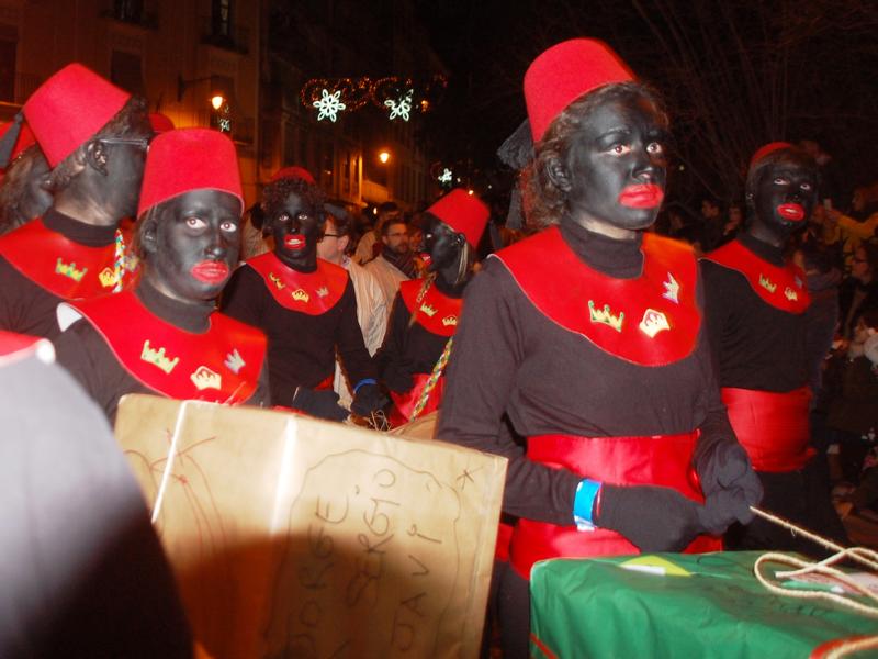 Die Reyes werden von schwarz gekleideten Pagen (pajes) mit schwarz geschminkten Gesichtern und breiten roten Lippen begleitet, die mit großen Holzleitern zu den Balkonen der anliegenden Wohnhäuser hochsteigen, um die bestellten Geschenke auszuliefern.
