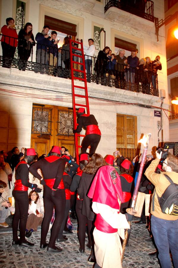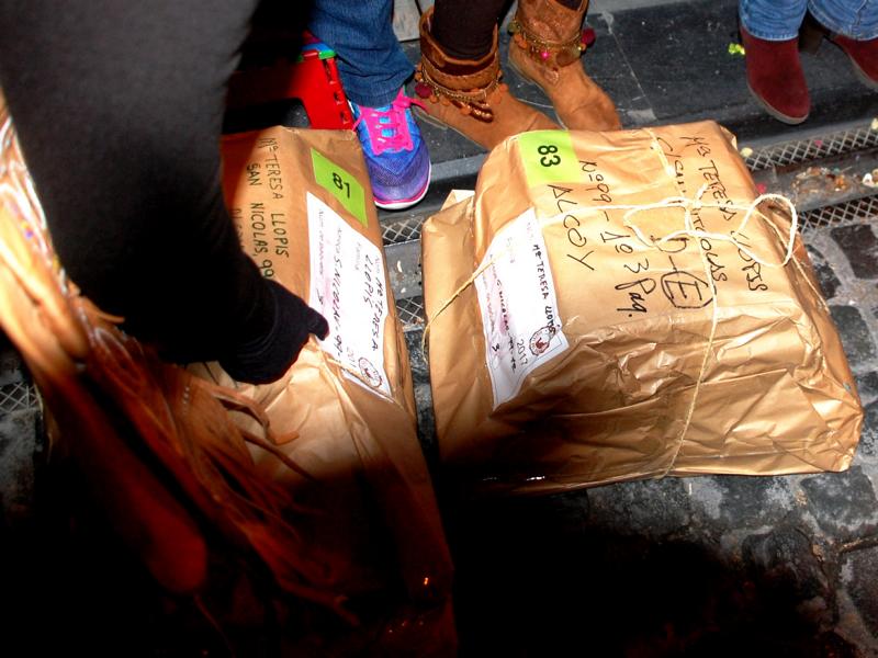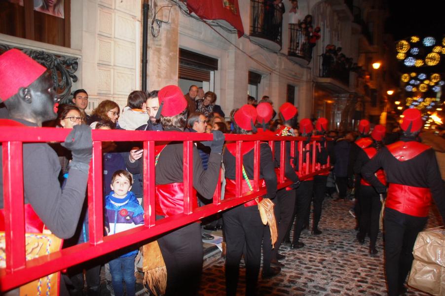 Doch bei den Umzügen in Alcoi gibt es eine weitere Besonderheit, die wohl einmalig ist: Die Reyes werden von schwarz gekleideten Pagen (pajes) mit schwarz geschminkten Gesichtern und breiten roten Lippen begleitet, die mit großen Holzleitern zu den Balkonen der anliegenden Wohnhäuser hochsteigen, um die bestellten Geschenke auszuliefern.