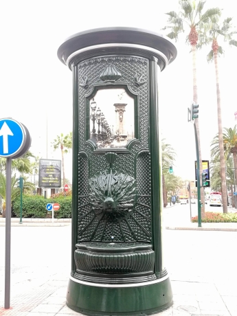 Nun aber in die Stadt. Als erstes faszinierte mich der Radfahrweg. Wo noch ist am Radfahrweg ein Vorfahrt-achten-Zeichen auf die Straße gemalt? diesen schönen Brunnen hielt ich natürlich für eine Litfaßsäule. Kleiner Spaziergang durch Almeria. Dabei ist mir aufgefallen, dass die meisten Frauen chic gekleidet waren. Obwohl ich ihre Schuhe heute nicht mehr anziehen würde. Typisch spanisch finde ich auch die Straßenfluchten, wo ein Hochhaus neben einem flachen Haus steht. Sieht man nicht nur in Almeria. Das Schmetterlingshaus war in seiner Zeit (1909) das höchste Gebäude in Almeria. Seinen Namen hat es von den Zierelementen am oberen Geländer. Bemerkenswert ist auch el cable Ingles, das Englische Kabel. Ein Pier, erbaut 1904 und genutzt bis 1973, für Erz, das aus Güterzügen in Schiffe innerhalb von 10 Stunden anstatt in 10 Tagen (ohne die Rampe) verladen wurde.