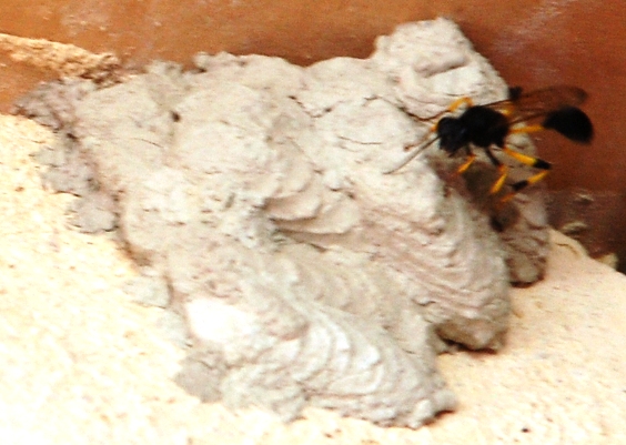 Meine Mörtelwespe scheint eine „Erstgebärende“ zu sein, denn ihr lieblos zusammen gekleckster Bau erinnert mich in seiner Form eher an eine Kokosflocke als an die normalerweise recht kunstvollen Kammern für die kleinen Grabwespen.