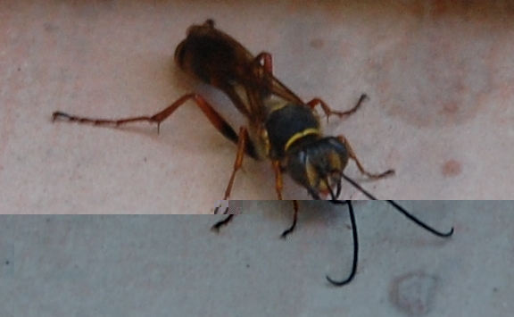 Seit Tagen kann ich wieder eine Sceliphron curvatum bei dem Bau ihrer Lehmkokons beobachten. Die Orientalische oder Indische Töpferwespe (andere Namen sind: Mauer- oder Mörtelwespe) stammt - wie der Name schon sagt - aus Indien, aber auch in Nepal, Pakistan, Kasachstan, Tadschikistan ist sie zu Hause. Sie wurde nach Europa eingeschleppt und tauchte 1979 zum ersten Mal in der Südsteiermark auf und verbreitet sich seitdem kontinuierlich - inzwischen auch in deutschen Städten. Die Töpferwespe ist ungefährlich, ihr Stachel ist für die menschliche Haut viel zu schwach. Sie lebt solitär und misst zwischen 13 und 20 mm Körperlänge.