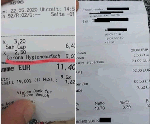 Man muss auch die Kundenseite sehen. Die wenigsten finden auf ihrem Gehaltszettel eine Erhöhung “Corona-Zuschlag“. Der Friseur mit der Abrechnung rechts, wird sicher „nach Corona“ weniger Kunden haben als vorher. Wenn ein Corona-Zuschlag akzeptiert wird, dann wandert er irgendwann einfach und leise in eine dauerhafte Preiserhöhung.