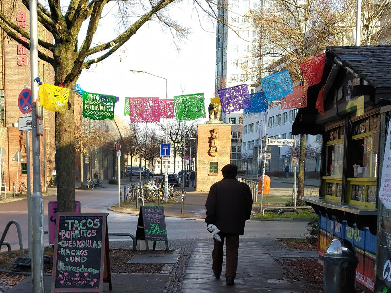 Das "Que Viva Zapata" hat Ende letzten Jahres aufgemacht. Er wird betrieben von "Cool Cam", dem Gebraucht-Großküchenausrüstungshändler mit türkischen Wurzeln bei mir hinter dem Haus. Der Imbiss verkauft Tequila und Tacos bei einigermaßen leisem Mexikogedudel. Nicht sehr erfolgreich, aber im Laufe des Jahres stand doch hin+wieder etwas Party-Volk davor. Die wurden sogar böse als ich Fotos machen wollte. Immerhin ist der Mexico-typische Totenkult dann wohl ein wenig angemessen.