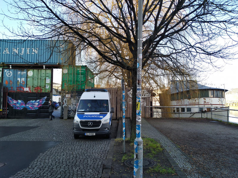 Für etwas Kontext noch ein Foto in die andere Richtung. Flussaufwärts steht ein weiteres Polizeifahrzeug vor dem nun gesperrten Uferweg.