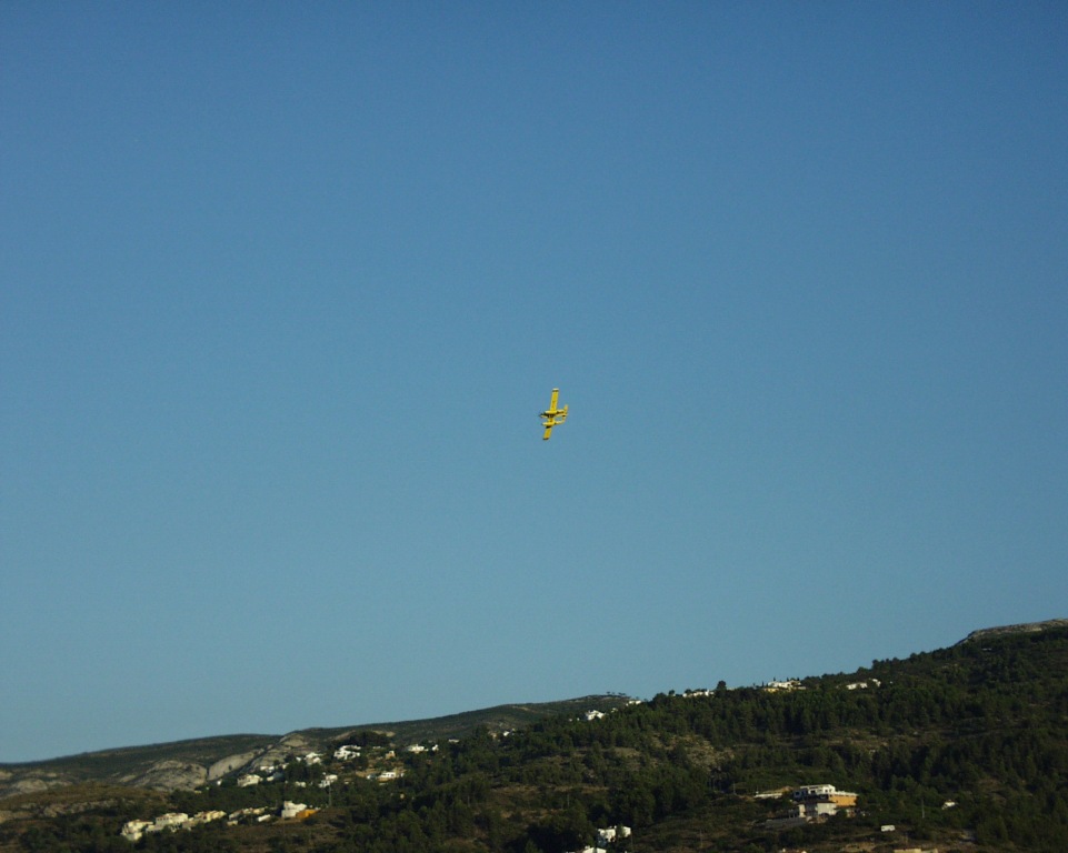 Die Piloten der beiden gelben Feuerteufel verstehen ihr Handwerk.. Anflug --- einmal drüber zur Orientierung -- Kampfkurve--