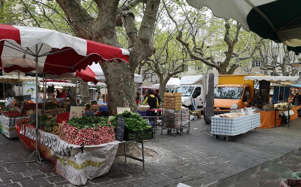 dürfen zurzeit öffnen, da ist es gut, wenn man sein Essen von zu Hause mitbringt, wenn man nach langer Fahrt nicht noch ein Restaurant suchen will, das Essen zum Mitnehmen (plats à emporter) anbietet. Einziges Highlight war am nächsten Morgen der örtliche Markt: