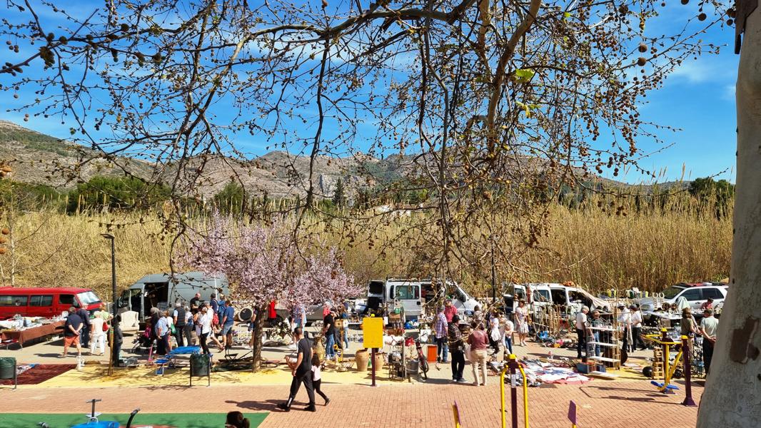 Der Flohmarkt in Jalón hat langsam wieder die Größe vor der Pandemie erreicht, und dehnt sich schon wieder bis zur Brücke über den Río Gorgos aus.