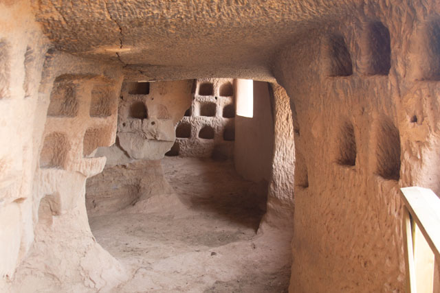 Ungewöhnliche, von Menschen erschaffene Gänge voller „Taschen“ an den Wänden. Der Ursprung geht ins 5. bis 7. Jahrhundert zurück und diente ursprünglich als Kloster. Die Nischen sollen dekorativer Natur gewesen sein und als Reliquienschreine gedient haben.