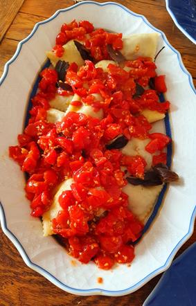 Salbeitomaten bedecken. Olivenravioli heiß servieren.