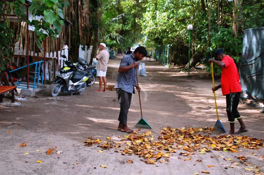 Sprachlich war es schwierig für uns. Das Personal für den Servicebereich besorgten sich die Malediver auf unserer Einheimischeninseln in Bangladesh. Vielleicht auch aus religiösen Gründen... So müssen die Malediver keine niedrigen Dienste für die Ausländer verrichten, man lässt arbeiten und beaufsichtigt. Und billig sind die Gastarbeiter auch noch. Bei uns waren ausschließlich junge Männer angestellt, sie bekamen alles zwei Jahre zwei Monate Urlaub bei einer 7-Tage-Woche. Trotzdem waren sie ganz offensichtlich glücklich auf den Malediven arbeiten zu können und sich dort ein finanzielles Polster für die Rückkehr in die Heimat zu schaffen. Sie hatten immer ein Lächeln auf den Lippen, Zeit für einen sehr gebrochenen Plausch, aber die Verständigung war schon sehr schwer für uns. Die Amtssprache auf den Malediven ist Dhivehi, in Bangladesh spricht man Bengalisch. Die Gastarbeiter müssen also eine neue Sprache lernen. Englisch haben sie zu Hause nicht gelernt und auch die Malediver sprechen wenig Englisch, meistens nur das, was man dringend benötigt.