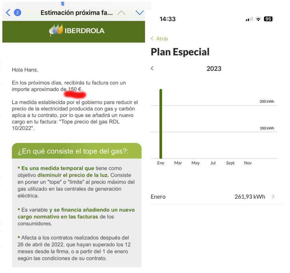 In Hinblick auf den "tope de gas" (Info: der Gaspreisdeckel in Spanien [er gilt nur auf dem Festland!!!!] gilt ab 15. Juni bis [voraussichtlich?] 31. Mai 2023) haben wir die Finger von einer Vertragsänderung gelassen (ohne nachzurechnen), denn unsere Stromrechnung ist seit September extrem niedrig.
