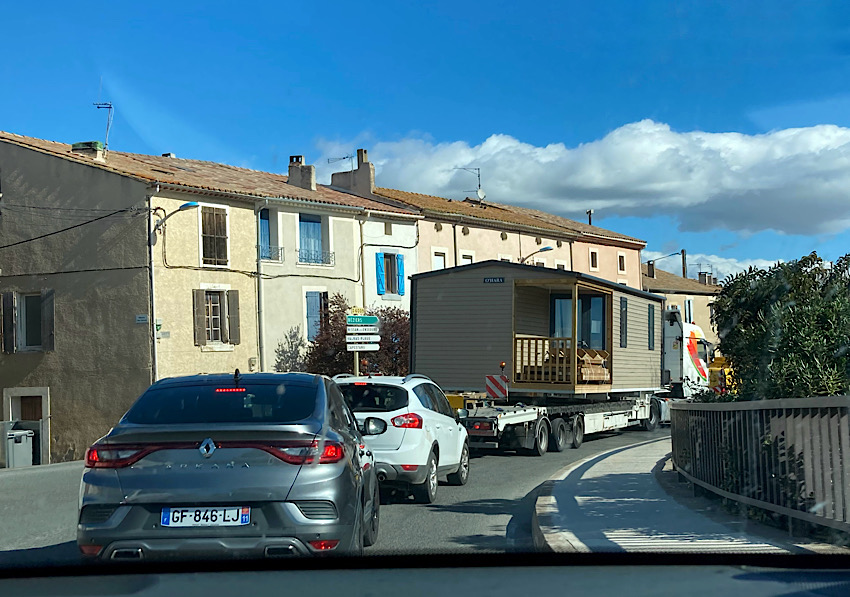 Mal wieder ging es durch kleine Ortschaften und heute auch mit einigen interessanten Sondertransporten (transport exceptionel). In Coursan hatten wir die Ehre, hinter einem rollenden Haus herfahren zu dürfen. Was für uns Kurzweil auf der Strecke war, machte jedoch so manchen Terminabhängigen reichlich nervös.