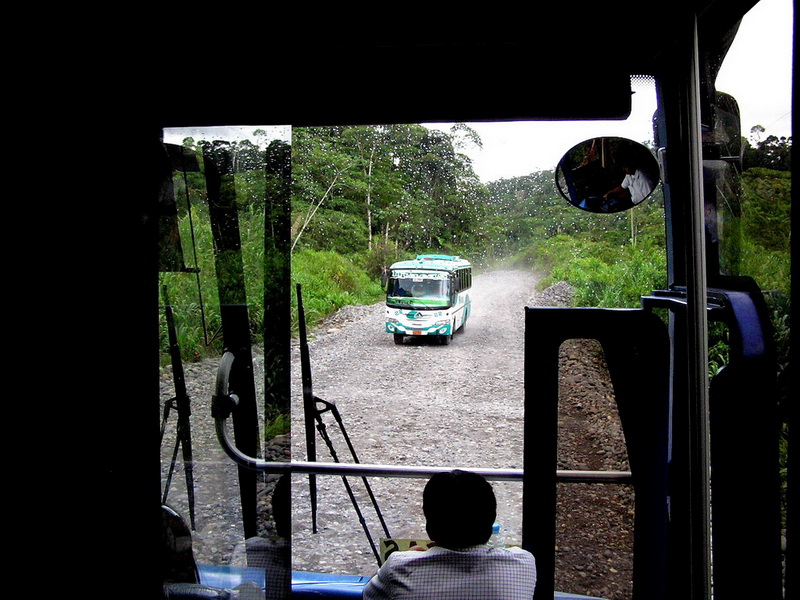 Über die Route sind wir jedoch völlig verblüfft. Nach wenigen Kilometern – wir haben inzwischen die Schlucht durchquert, und das gute Asphaltband steigt am gegenüberliegenden Hang steil noch oben – biegt unser Fahrer auf eine Naturstraße nach rechts ein. Wir vermuten, er will vielleicht zu einem Gehöft, um etwas abzuholen, oder ein nahegelegenes Dörfchen soll kurz angefahren werden. Es geht höher und höher, bis wir schließlich in die tief hängende Wolkendecke eintauchen. Irgendwann wird uns klar: auch hier geht es nach Guayaquil ! Fast unglaublich, in welche Höhen sich der Bus auf diesem „Feldweg“, wie wir ihn bezeichnen würden, nach oben schraubt. Immer wieder steigt jemand aus. Auf der Karte finden wir tatsächlich eine gelb einge-zeichnete Nebenstrecke über irgendwelche Andenhöhen in südwestlicher Richtung. Das muss diese „Straße“ wohl sein.