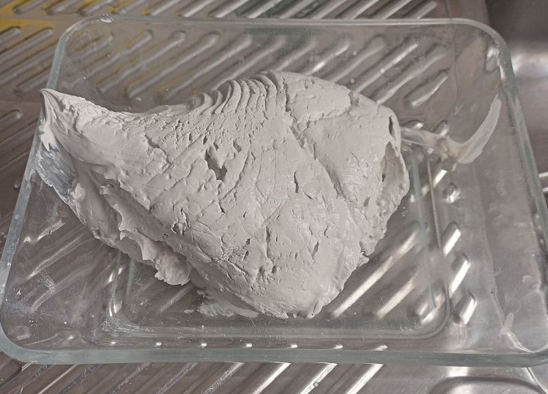 Dann sollte man es mit etwas Wasser verdünnen, dabei schön mit dem Spachtel rühren. Nicht zu wenig Wasser ("Pudding") und nicht zu viel Wasser ("Sahne"). Ganz nach individueller Präferenz und vorhandener Tröpfchengröße. Dann sieht es so aus: