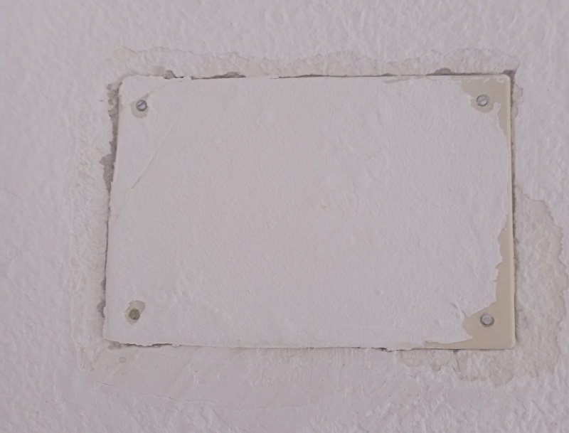 Jetzt kommt der spannende Teil. Den man sich auf verschiedenen Youtube-Videos anschauen kann. Die Standard-Technik ist: einen größeren Kleks auf eine Kelle geben und mit den roten Spezial-Plaste-Pinsel (siehe oben) schnell über den Rand in Richtung Wand wischen. Die so an die Wand fliegenden Tropfen bleiben hoffentlich dekorativ hängen. Ich habe das nicht hinbekommen und es ist sowieso eine Riesensauerei. Ich bin daher auf "Tupfen" ausgewichen: den Plaste-Pinsel etwas in die Pasta eintauchen und dann schön schnell an die Wand tupfen. Damit bekommt auch größere Dinge "Eingegipst" bzw. "Spanisch weggemogelt", z.B. diese vom Elektriker aufgemachte Verteilerdose