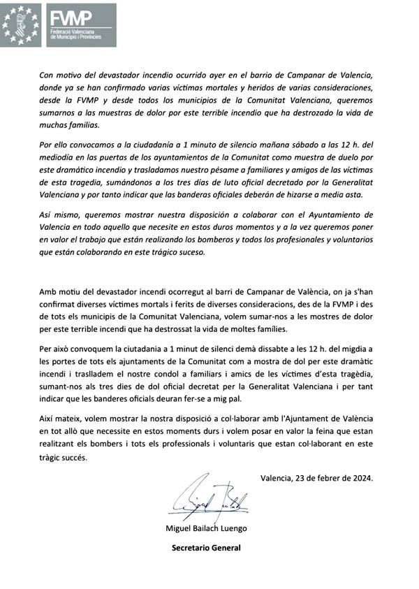 FVMP hat geschrieben:Wir rufen daher die Bürger auf, am morgigen Samstag (also heute) um 12 Uhr mittags an den Toren der Rathäuser der Comunitat eine Schweigeminute einzulegen, als Zeichen der Trauer über diesen dramatischen Brand, und wir sprechen den Familien und Freunden der Opfer dieser Tragödie unser Beileid aus, indem wir uns den drei Tagen der offiziellen Trauer anschließen, die von der Generalitat Valenciana angeordnet wurden, und weisen daher darauf hin, dass die offiziellen Flaggen auf Halbmast gesetzt werden sollten.