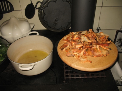 Ich sehe deinen schönen alten Herd,die Kochutensilien ,die Pllze im Emailie Topf