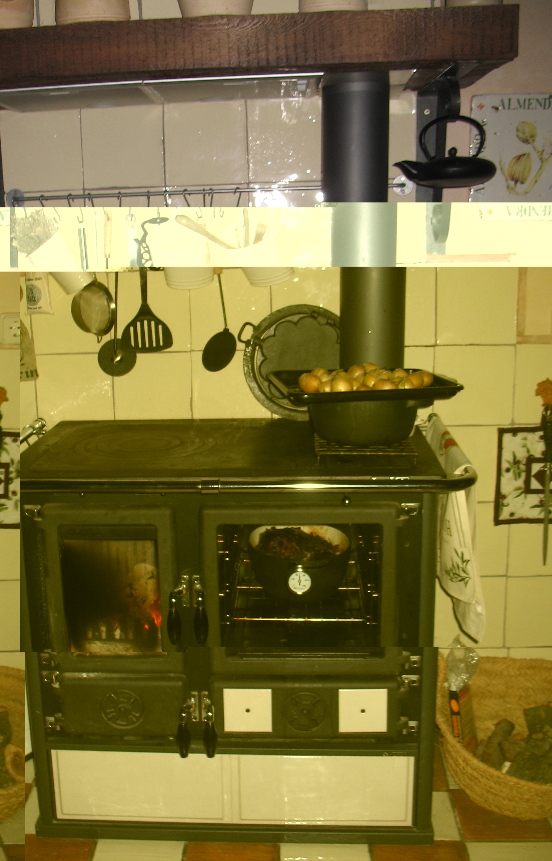 Ich sehe deinen schönen alten Herd,die Kochutensilien ,die Pllze im Emailie Topf