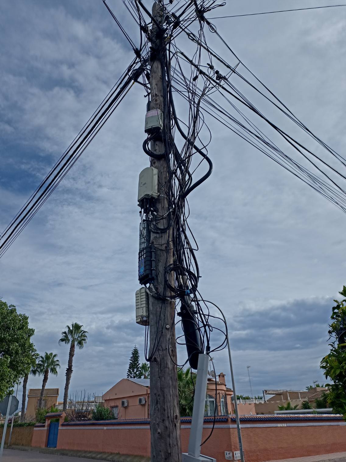 Offenbar kann jeder in Spanien ohne Bauantag und Umweltverträglichkeitsgutachten einfach so eine Glasfaserstrippe über die Staße ziehen. Und niemand klagt dagegen, wäre in DE undenkbar. Hat natürlich auch Nachteile, wie man hier um die Ecke bewundern kann.