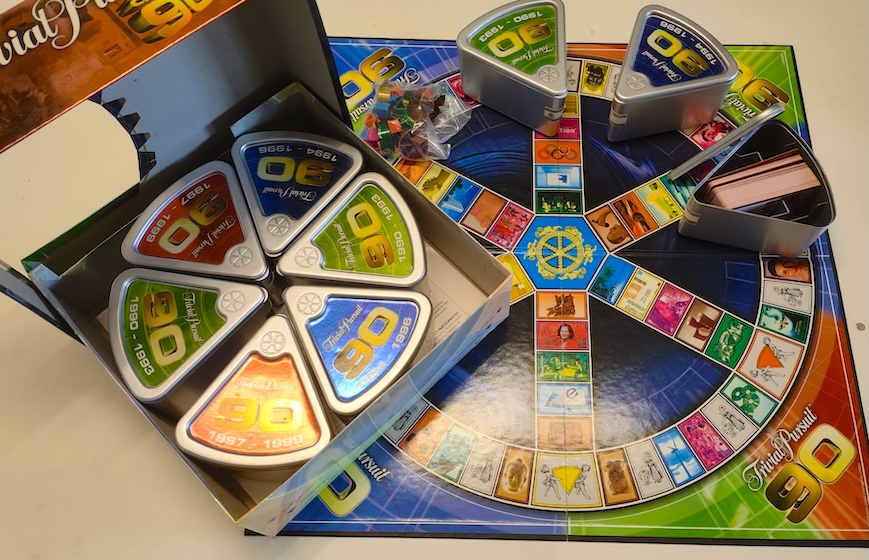 Das Spiel ist aus diesem Jahrtausend, allerdings mit Fragen rund um die 1990er, und seit wir Kinder haben und nur noch banale Brettspiele machen können, die auch für Grundschüler geeignet sind, stand das Spiel nur noch im Schrank.