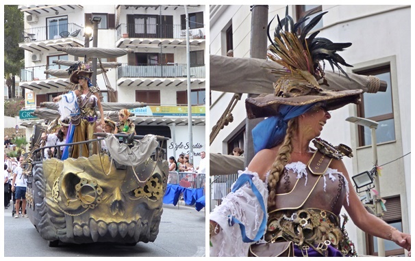 die Kostüme sind von Kopf bis Fuß passend und auch die Rückansicht ist sehenswert auch ein Piratenboot war dabei zwischendurch wurde getanzt auch ein Drache schlängelte mit Inzwischen ist es fast dunkel An der Burg von Moraira löste sich der Umzug auf. Zum Abschluß gab es noch ein Feuerwerk. Saludos