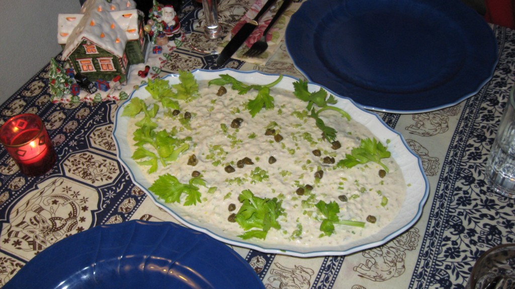 und in Brühe mit Suppengrün leise köcheln lassen. In der Zwischenzeit Küchenkräuter (die gerade zur Hand sind) z. B. Petersilie, Schnittlauch und Estragon nebst Meersalz klein hacken, die Hähnchenbrustteile in Olivenöl mit den Kräutern marinieren und zugedeckt ein paar Stunden ziehen lassen. Derweil eine Mayonaise anmachen. Sonnenblumenöl tropfenweise unter Rühren auf ein Eigelb/Senfgemisch (Zimmertemperatur) geben, bis dieses fest ist, dann unter Rühren langsam eine Tasse von der Hühnerbrühe dazugießen. In diese etwas dünnere Majo 200 g Thunfisch, 2 Eßlöffel kleingehackte Kapern, 3 kleingehackte Anchovis, sowie eine ganze Menge kleingehackten Staudensellerie, Salz und Pfeffer zufügen. Für mich kann es nie genug Sellerie sein..... von dem gehackten Sellerie und dem inneren Blattgrün etwas aufheben für die Garnitur. Sodann das marinierte Kräuterhühnchen auf einer Platte anrichten und die Sauce darübergießen bis das Fleisch ganz bedeckt ist. Die Platte zugedeckt noch ca. 2- 3 Stunden im Kühlschrank aufbewahren. Mit Kapern und dem gehackten Staudensellerie und den inneren Sellerieblättern garnieren. Wer will kann auch mit kleinen Tomaten und Salat außen herum garnieren. Dazu habe ich getoastetes Brot gereicht. Kam bei den Gästen und mir sehr gut an! Nach dem Verzehr ist ein ausgedehnter Spaziergang zu empfehlen..... >:d<