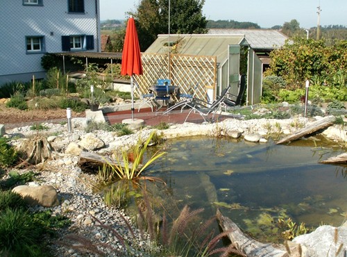 Das sind meine halbschattigen Pflanzen. Tellerhortensien, Christrosen, Baumpäonien. Ein Sandsteinmäurchen habe ich gefertigt um den Aushub vom Weiher und des Sitzplatzes aufschütten zu können. Die Topfpflanzen stehen eher zufällig auf der Mauer. Hortensien sieht man im Süden doch auch ab und zu. Im Normalfalle stehen sie eher begleitend beim Sitzplatz und verkörpern auch etwas Spanischen Flair. Die Topfpflanzen und neuerdings auch die etwa neun in Töpfe gepflanzten grosse Rosmarinstöcke (mehrheitlioch vom Mediteranen Hügel) überwintere ich im Gewächshaus mit Frostwächter. Rosmarin überdauert freistehend nicht bei mir.