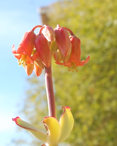 Bei deiner Pflanze mit den Glöckchen habe ich erst auf eine Echeverie getippt, die blüht bei mir auch gerade. Die Blüte sieht ähnlich aus, aber deine Pflanze hat ganz andere Blätter als meine. Bei deiner müsste es sich um eine Brutblattart, z.B. eine Kalanchoe daigremontiana handeln, meiner Meinung könnte es eine sein, eine Sukkulentenart aus Madagaskar. Die Ableger wachsen direkt an den Rändern der Blätter, das kann man auch auf deinem Foto erkennen.Blüte(Nahaufnahme).