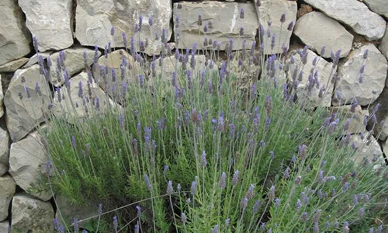 Dicke Posten von Schopf-Lavendel (Lavandula stoechas) blühen bis in den Sommer hinein, und macht sich auch gut vor der ebenfalls lila blühenden Kreuzblume.