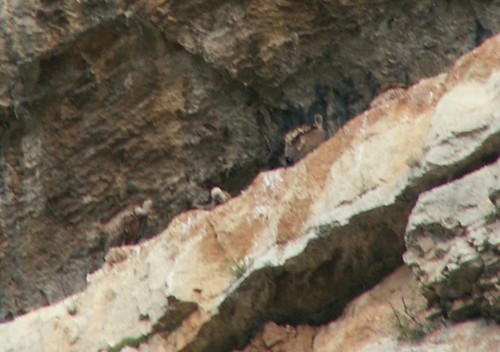 An alle die immer noch nichts sehen, ein Bildausschnitt mit starker Vergrösserung. Wenn ich auch eigentlich Gänsegeier als Antwort gewünscht hätte, hat doch Clark richtig erkannt, dass wenn es keine Adler sind es sich um "weiss der Geier" handeln müssen. Akinom hat dann präzis mit Gänsegeier nachgedoppelt. Darf sagen, wenn man keine Altvögel anfliegen sieht, ist es recht schwierig die Jungen im fast gleichfarbigen Felsen auszumachen. Manchmal deuten Kotspuren auf ein Nest hin. Muss sagen, bist mit dem Fernglas beschäftigt und nicht wenig, dann warten, warten und nochmals warten bis die Altvögel anfliegen.