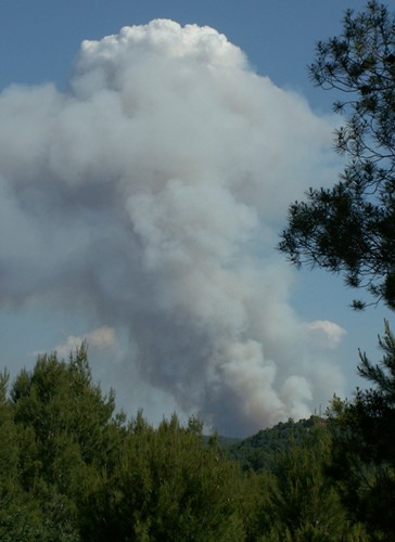 Wir haben nur gesehen, wie der Himmel dunkel wurde und haben das Feuer gerochen. Der Branherd lag ungefähr 7 km von uns entfernt. Am Ende unseres Caminos bot sich das obige Bild. Heute haben wir gesehen, dass es einen ganzen Berg erwischt hatte, der mit Pinien und dichtem Unterholz bewachsen war. Das brennt natürlich besonders gut.