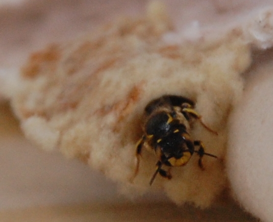 Gestern habe ich eine Wollbiene (korr. um 18.26 Uhr, ich hatte Grabwespe geschrieben) beim Bau ihres Kinderszimmers beobachtet. Obwohl es Websites über Grabwespen mit ausgezeichneten Fotos gibt, habe ich das Exemplar, das ihren Nachwuchs in eine Art Kokon abgelegt hat, nicht bestimmen können. Es hat am Hinterleib fünf gelbe Binden. Die Wespe ähnelt dem Ectemnius cf. lituratus / "Fliegenjäger", doch die angelegte Brutkammer entspricht nicht dieser Art. Da es etliche ähnlich aussehende Grabwespen gibt, ist ihre Bestimmung für den Laien schwierig.