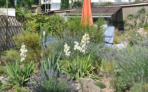 Mediteraner Hügel, am blühen sind Palmlilien, Lavendel, Rosmarin und Thymian. Dahinter Sonnensitzplatz.